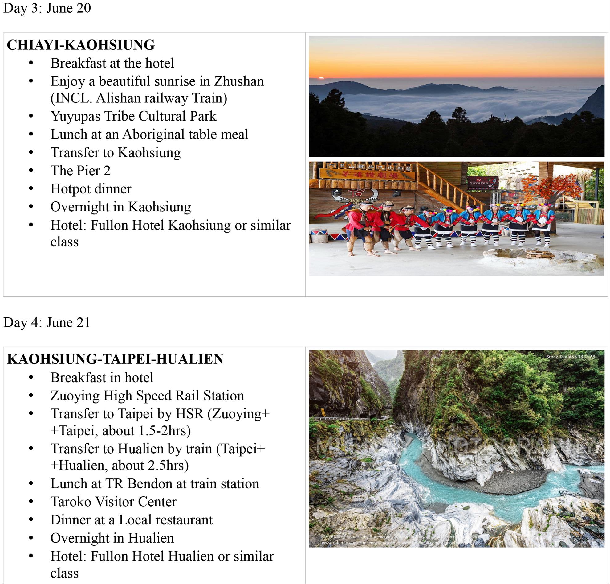 The Tour of Taiwan itinerary is finalized! The seven-day Tour of Taiwan will begin the day after the end of the Rotary International Convention and introduce the culture, treasure, and natural beauty of Taiwan to the participants. See the attached PDF for the tour description, schedule, and pricing.