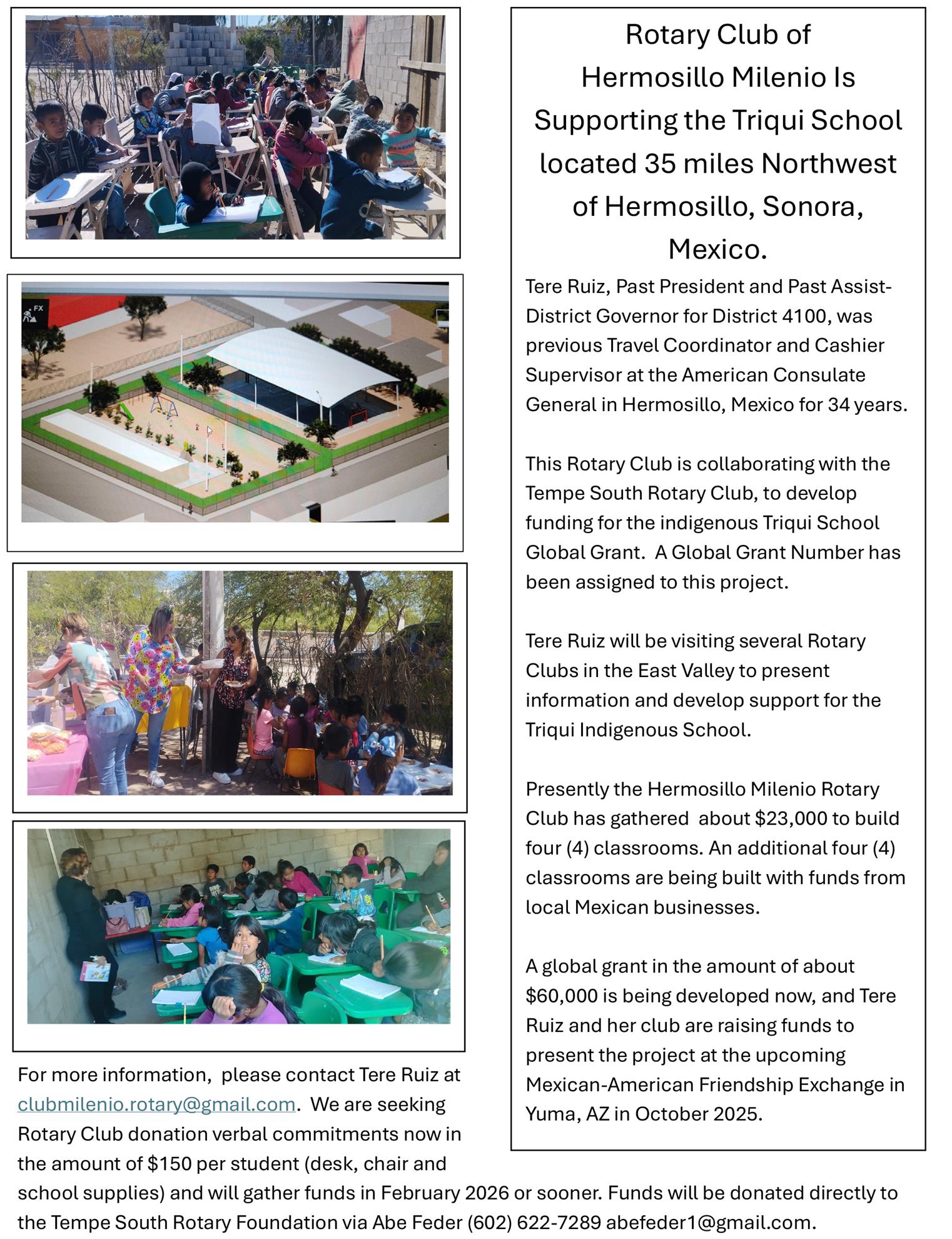Global Grant GG 2578729 For Your Consideration at The Mexican/American Conference The above global grant supporting the Triqui School in Mermosillo will be one of many global grants presented at the Mexico-USA Friendship Conference later this month in Yuma. Click here to learn more about the conference!